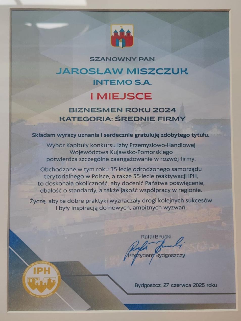 Z przyjemnością informujemy, że Jarosław Miszczuk – Prezes Rady Nadzorczej INTEMO S.A. – został uhonorowany prestiżowym tytułem Biznesmen Roku 2024 w kategorii „Średnie Firmy”. Dodatkowo otrzymał wyróżnienie „Ze Złotą Pieczęcią Izby” przyznane przez Izbę Przemysłowo-Handlową Województwa Kujawsko-Pomorskiego.