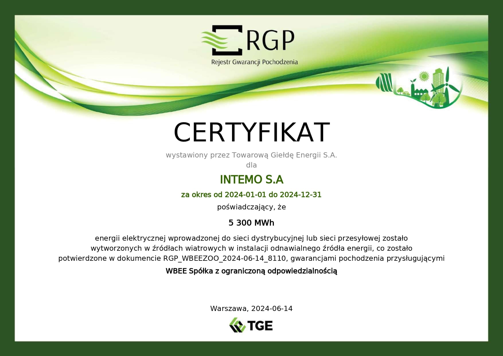 W 2024 roku, cała energia elektryczna zużywana przez firmę Intemo S.A. pochodzi z odnawialnych źródeł energii, a konkretnie z instalacji wiatrowych. Towarowa Giełda Energii S.A. wystawiła certyfikat, który potwierdza, że 5 300 MWh energii elektrycznej wprowadzonej do sieci dystrybucyjnej lub przesyłowej zostało wytworzonych w źródłach wiatrowych.